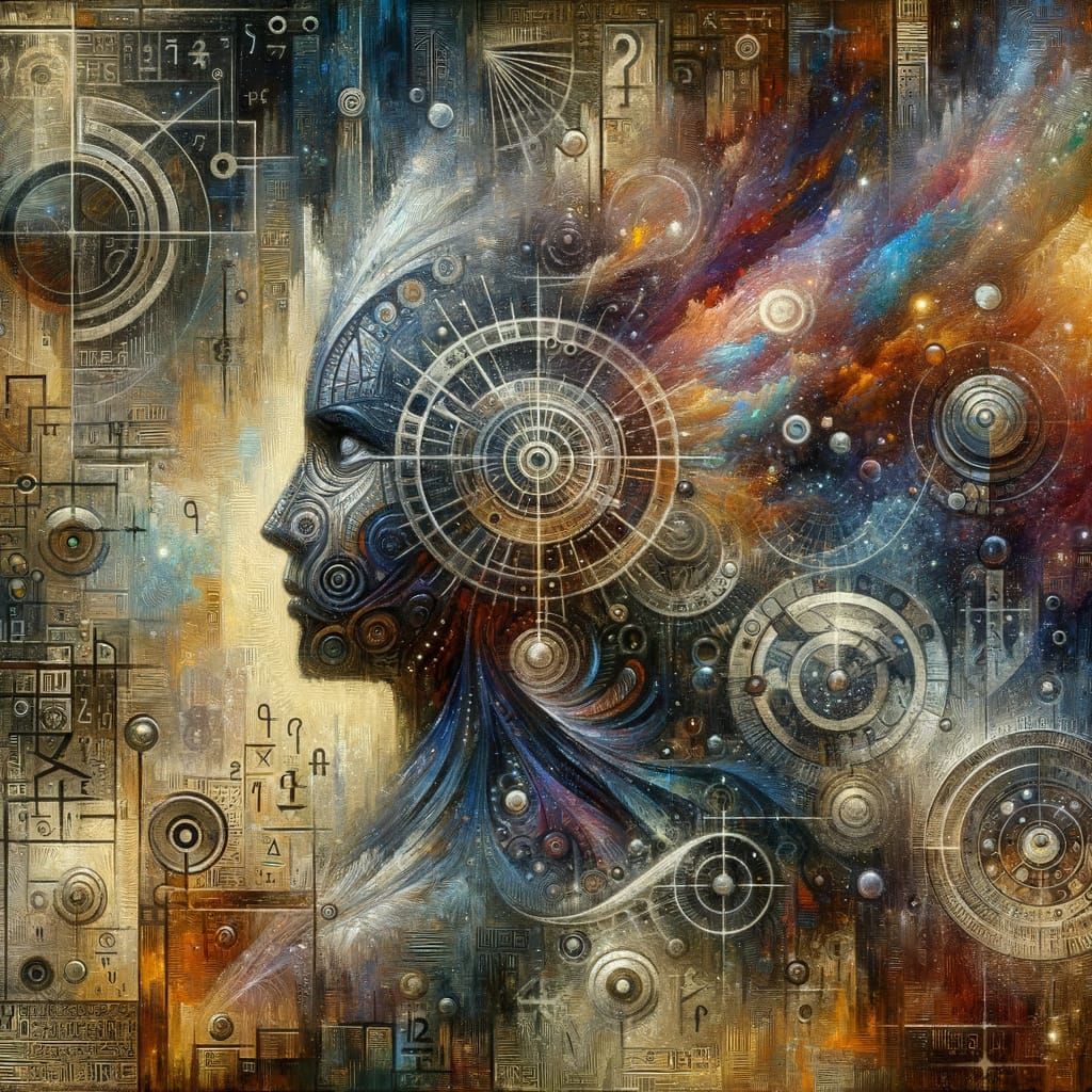 This image shows a complex abstract artwork inspired by early Native American culture and mythology. It features glyphs, mathematical symbols, ethereal figures, and spacecraft icons in a maximalist digital matte painting style.