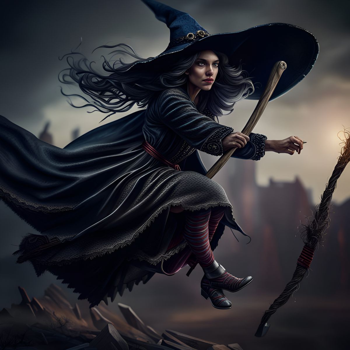 A captivating image of a witch soaring on her broomstick. The picture features intricate details, high contrast, and a cinematic, atmospheric mood, rendered in hyperrealistic style.