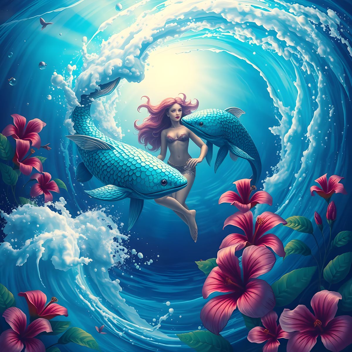 This image depicts a mythological scene of two twin ichthyocentaurs assisting Aphrodite as she emerges from the sea in a tropical setting.