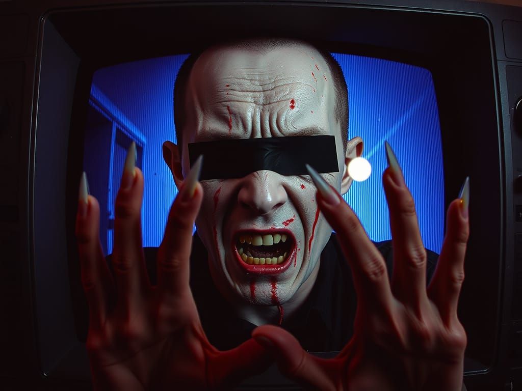 This image depicts a terrifying figure with melting skin and sharp nails, set against a backdrop of television static. The unsettling scene evokes analog horror aesthetics with deep, contrasting colors.