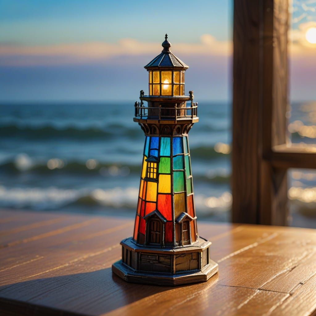 A stunning miniature sculpture of a stained glass lighthouse figurine, set against a warm glow of soft natural light, showcasing intricate details and delicate textures of colorful glass art.