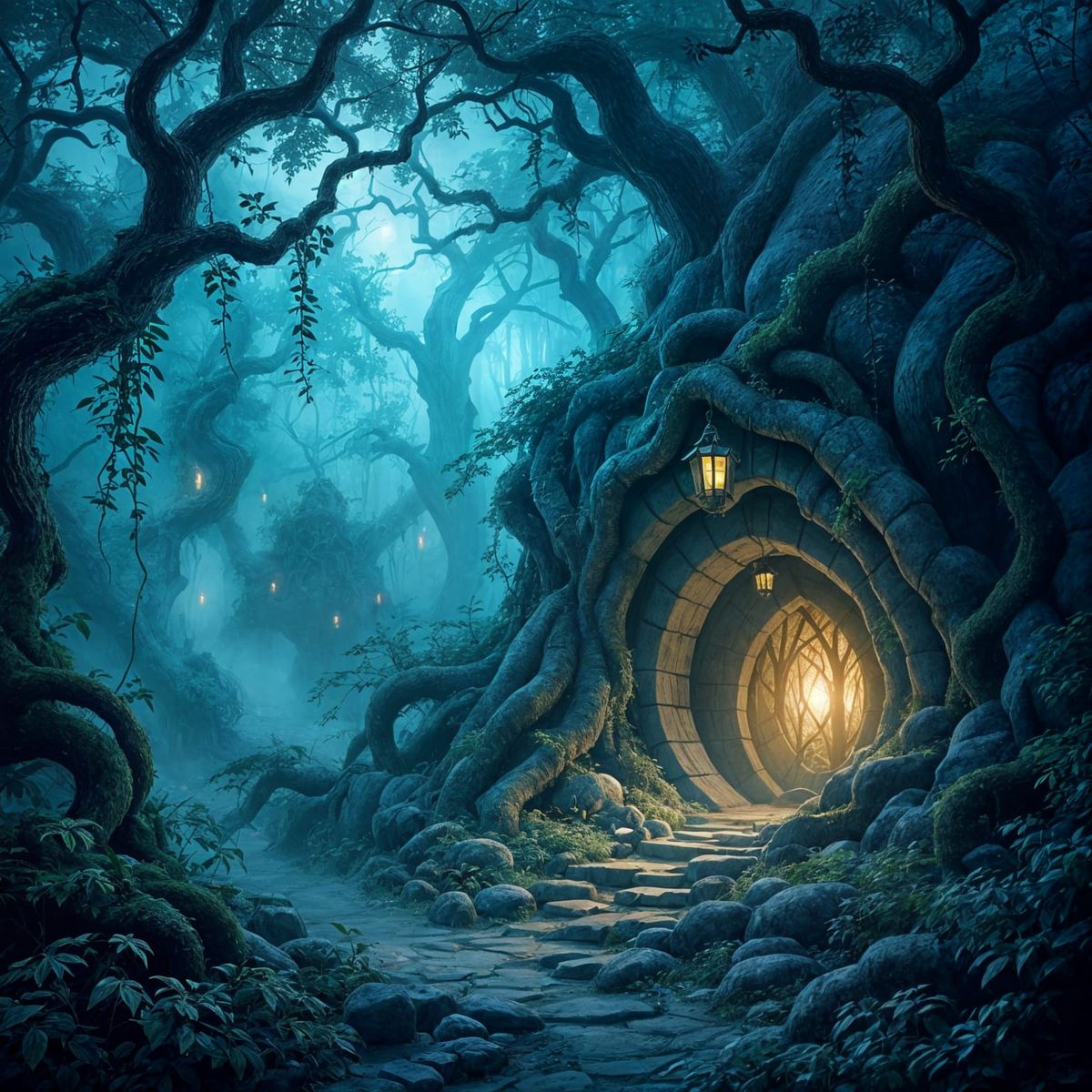 This image showcases a magical witches cavern nestled within a misty, twilight forest. Enchanted, painterly visuals with cinematic lighting create a nostalgic, ethereal glow.