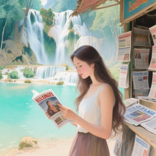 This image showcases a feminine woman reading a magazine at Kuang Si Falls, Laos. Rendered in a soft, pastel watercolor style with low-contrast hues, it evokes a serene and dreamy atmosphere.