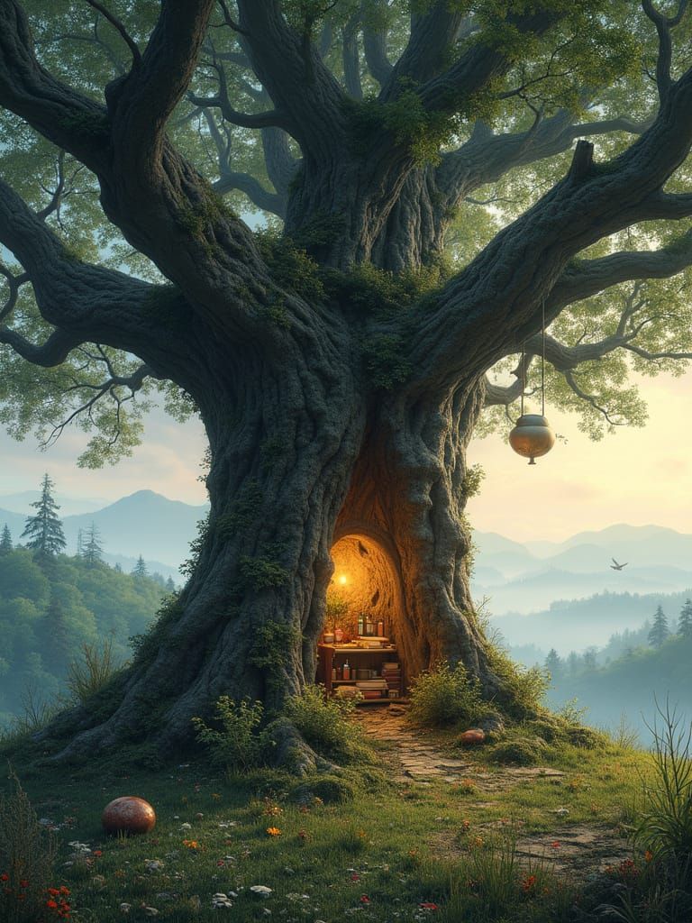 This enchanting image captures a majestic oak tree standing atop a hill, its ancient trunk adorned with polypore conks and vibrant green branches. A mysterious hole in the trunk reveals a cozy sanctum filled with leather-bound books, candles, and plush pillows, surrounded by a tapestry of medicinal herbs...