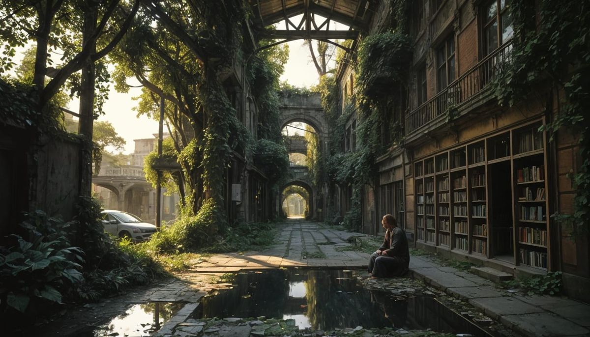 This concept art depicts an abandoned city street reclaimed by nature, with vines, bioluminescent plants, and a traveler resting near a ruined library.