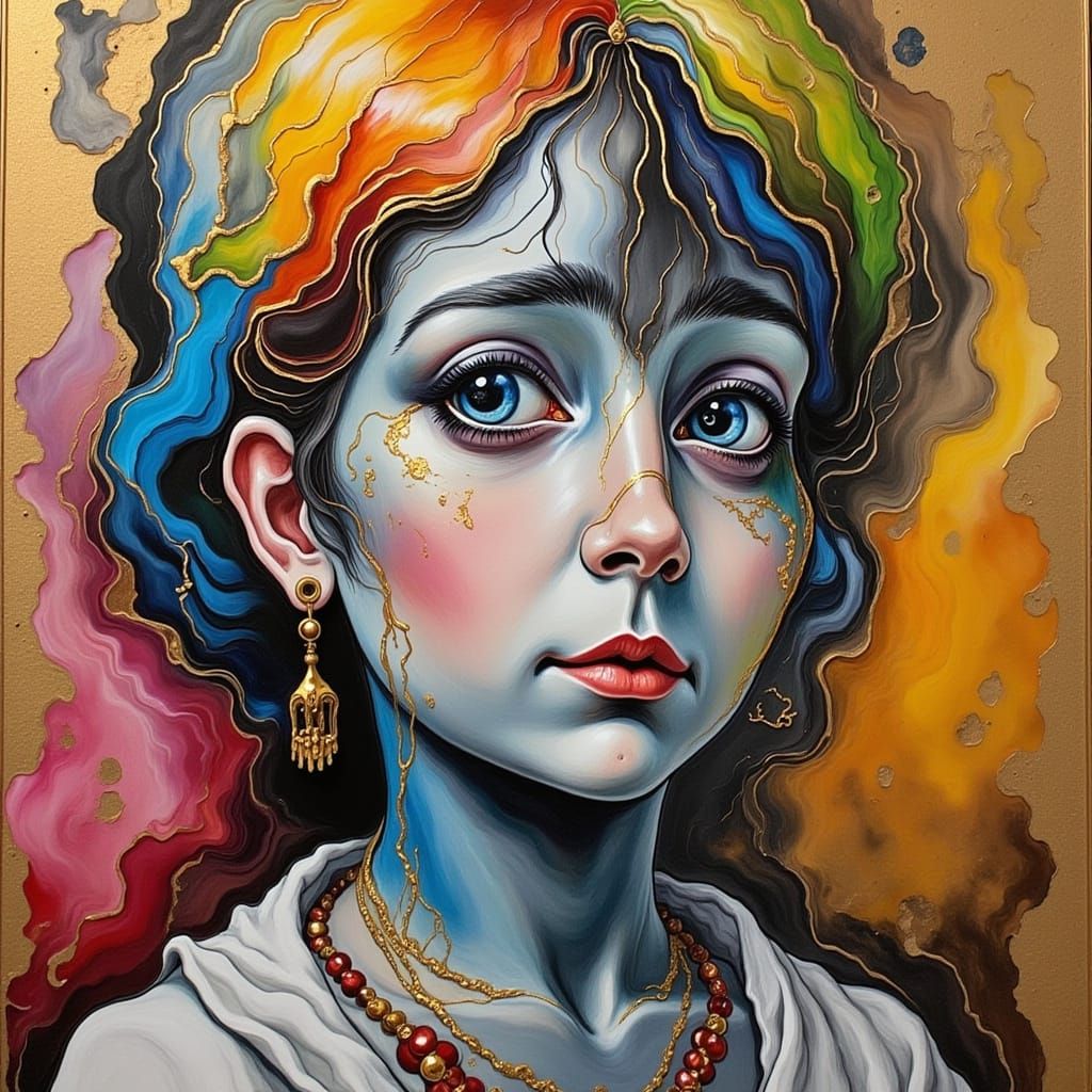 This image is a portrait of a young gnome statue set against a colorful background, reminiscent of the works of Toulouse-Lautrec. The artwork features gray or black marble with gold streaks, created using alcohol ink.