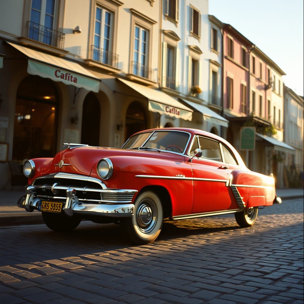 This image shows a cherry-red 1950s classic car parked on a cobblestone street. Soft sunlight illuminates the vehicle, creating a nostalgic, cinematic atmosphere with a shallow depth of field.