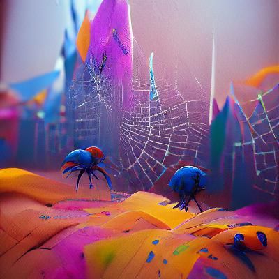 A detailed matte painting featuring spiders in a fantastical setting. The image has deep colors, intricate details, and complementary color schemes, reminiscent of fantasy concept art in 8k resolution.