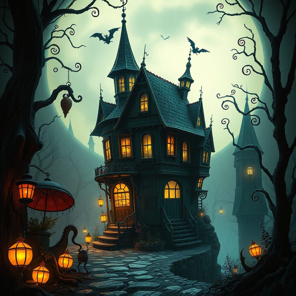 A gothic scene in a whimsical dark fantasy style. The image features intricate details, a mysterious moonlit atmosphere, and an eerie, Tim Burton-inspired aesthetic.