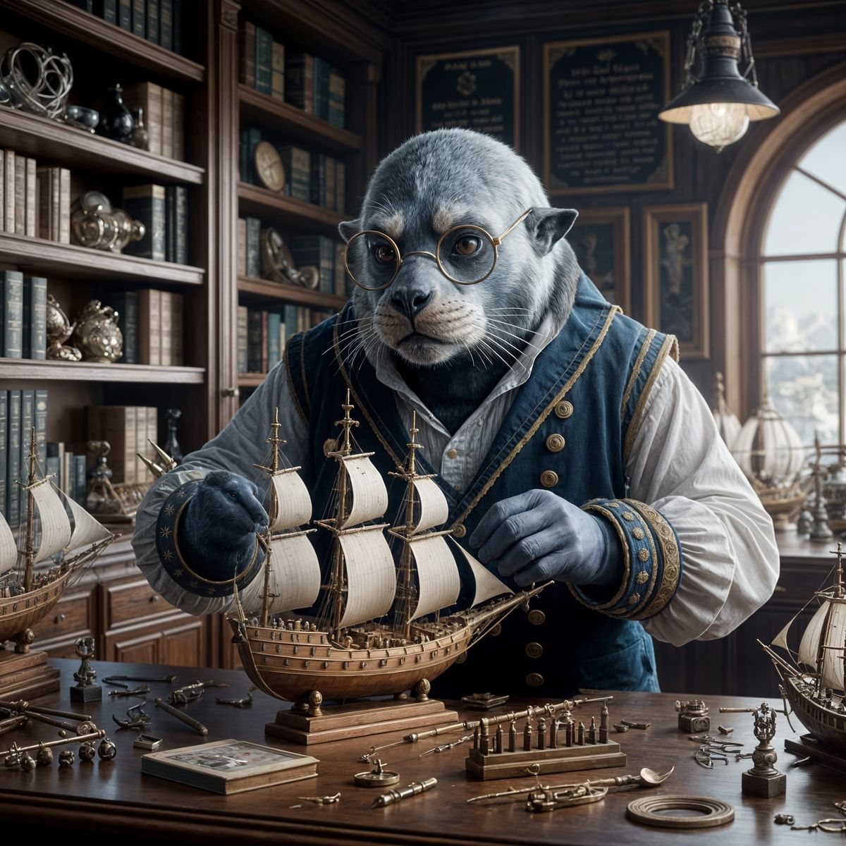 This captivating image shows a meticulously detailed scene of an anthropomorphic sea lion crafting miniature sailing ships in a fantastical workshop, surrounded by intricate tools and half-finished models, reminiscent of high-end fantasy concept art with deep color and intricate detail.