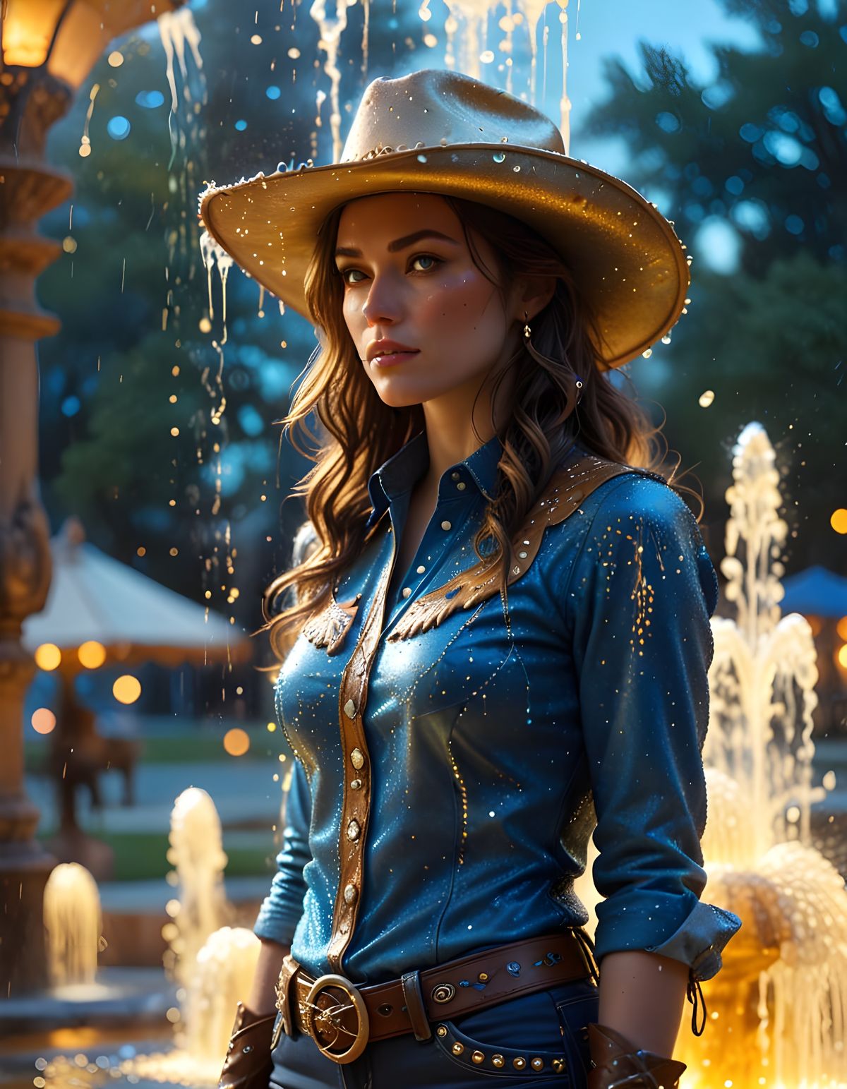 A surreal medium shot of a cowgirl near a fountain of liquid light. The fantastical artwork has glowing droplets, soft textures, warm gold lighting, and blue accents in a dreamy style.