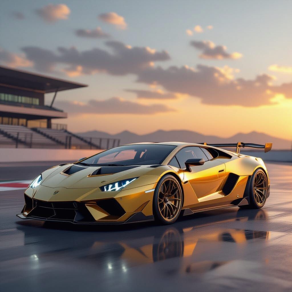 This image shows a gold Lamborghini race car on a futuristic track. The vehicle's design features sharp angles, aerodynamic curves and black carbon fiber accents, rendered in a photorealistic style.