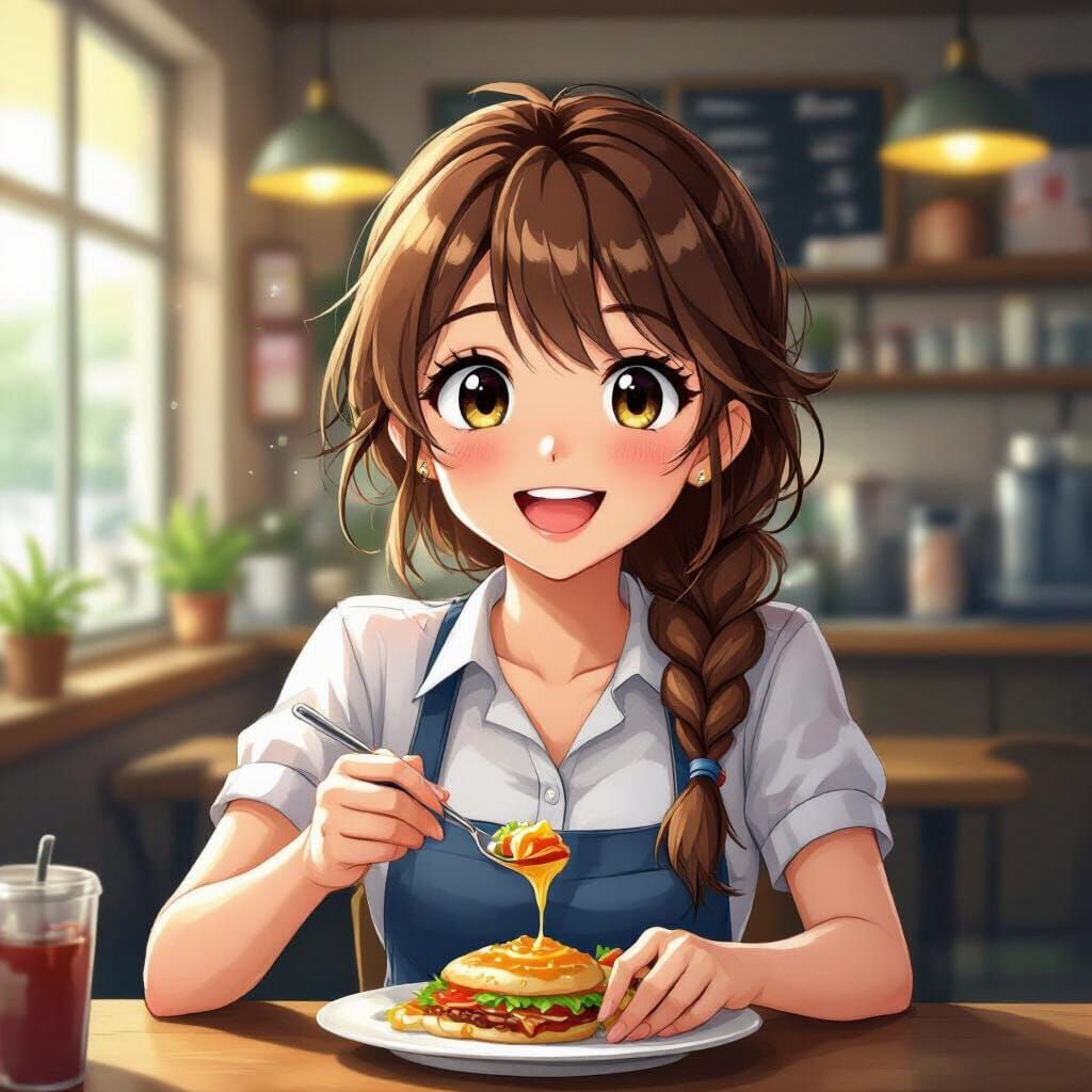 A cheerful young woman works in a diner. This anime-style image features bright colors and cel-shaded animation, reminiscent of Studio Trigger's work.
