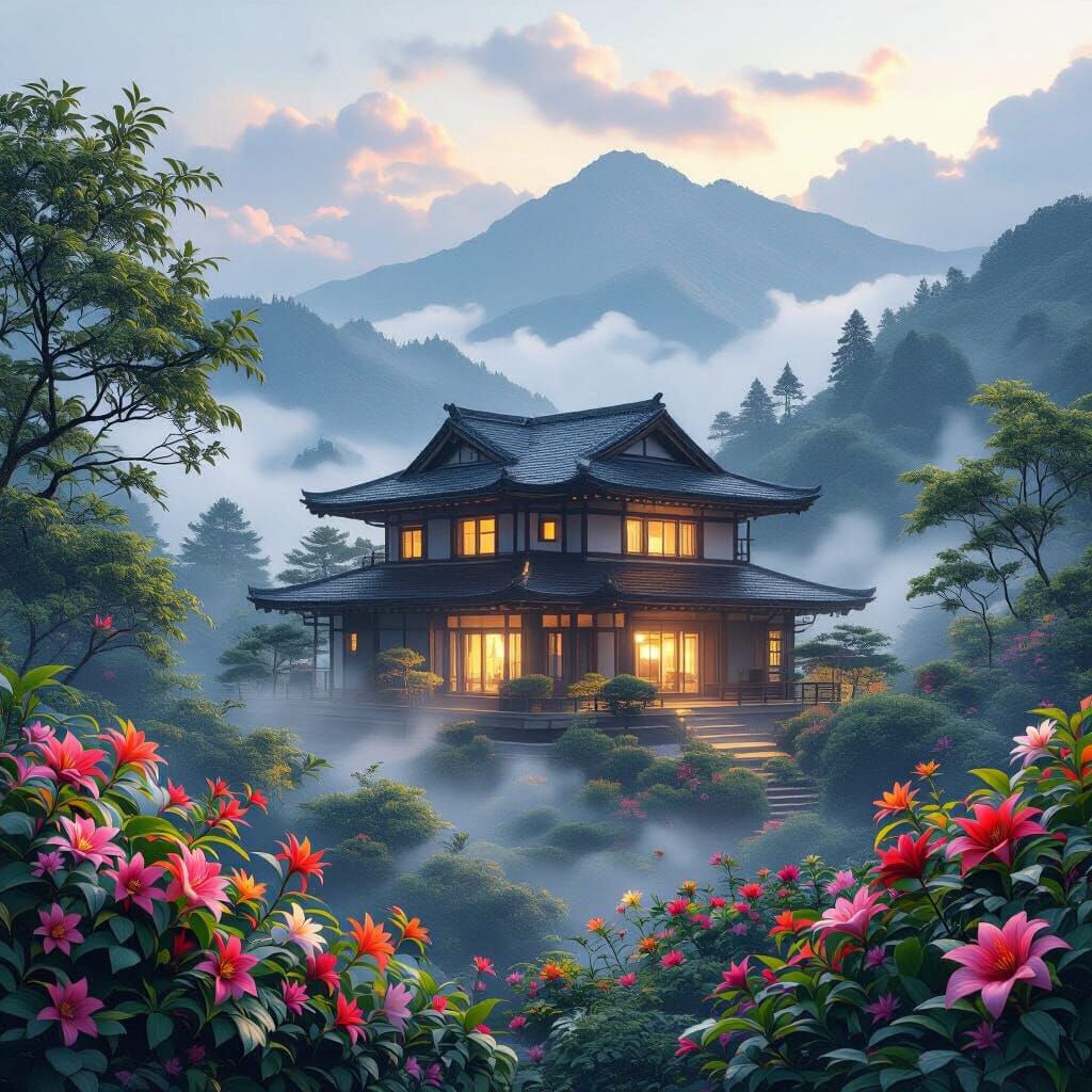 This image shows a hyperrealistic Japanese home in misty mountains, with trees and vibrant flowers. It has a heartwarming, ethereal fantasy atmosphere with soft, glowing light.