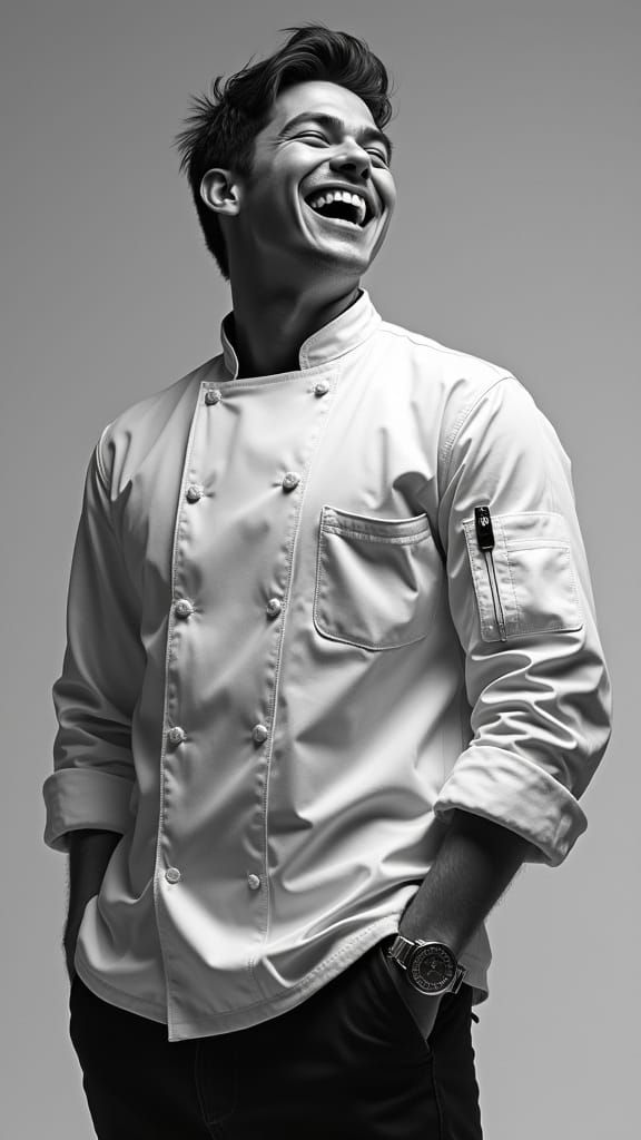 This image showcases a hyper-realistic, monochrome portrait of a young man in a chef's uniform. His stylized form and radiant smile emphasize warmth and charisma, captured with exceptional detail.
