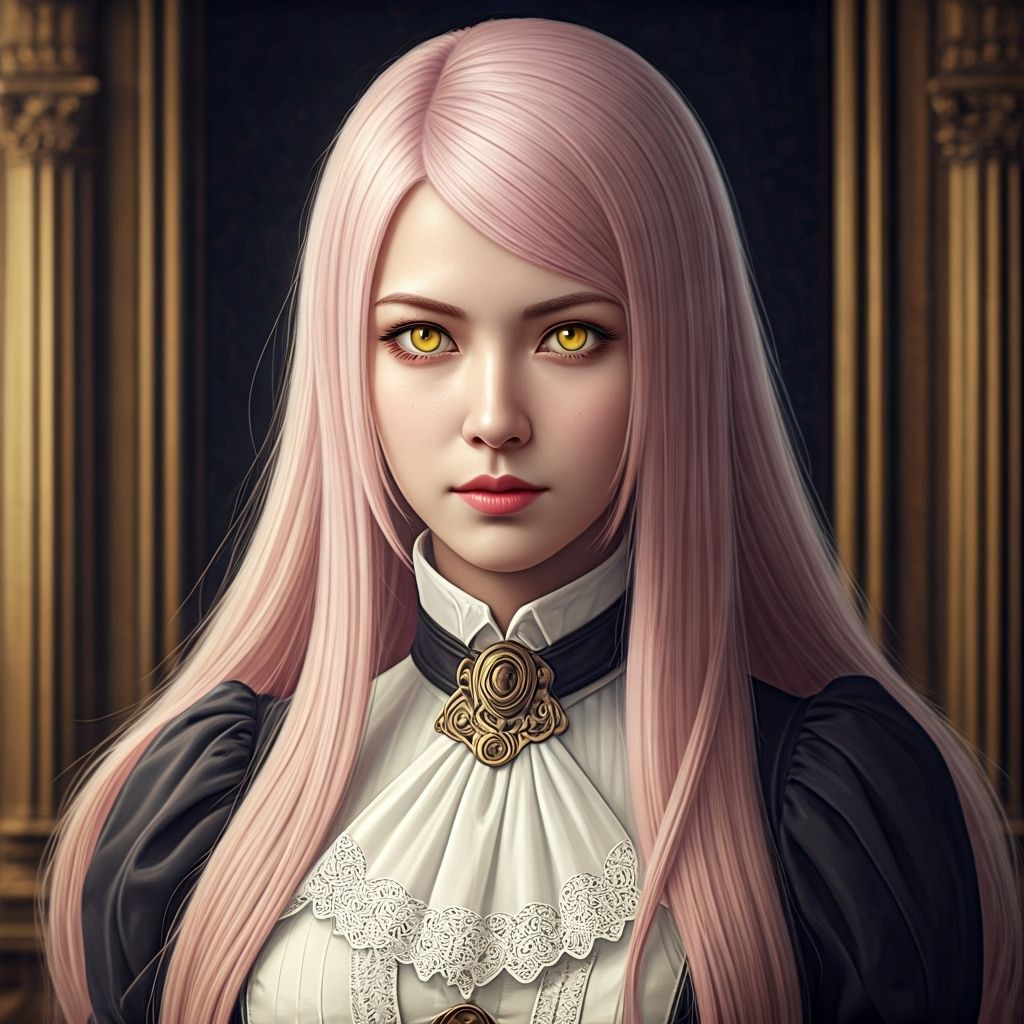 This image shows a beautiful woman with long pink hair and yellow eyes in vintage clothing. The hyperrealistic photograph evokes the charm of the 1900s with meticulous detail.