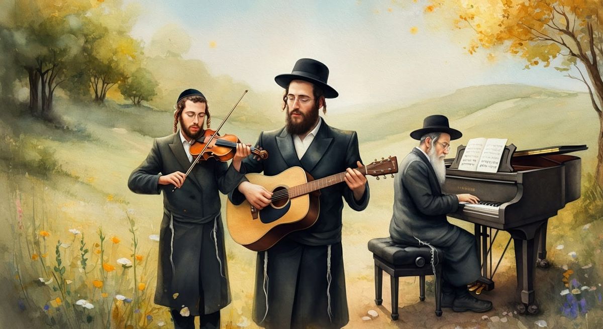 A watercolor painting shows three Hasidic Jewish musicians playing instruments outdoors. The serene landscape and soft pastel tones create a spiritual and contemplative mood.