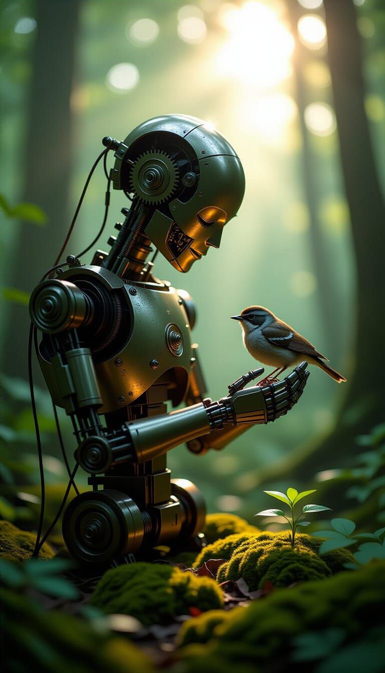 An antique automaton, its gears and wires exposed, stands in a dense, ancient forest. Sunlight filters through the canopy, creating dappled patterns on its metallic form and the mossy ground. The automaton is carefully tending to a small, injured bird nestled in its hand. The style blends the texture and light of Impressionism with the narrative depth of surrealism, executed with a digital art sensibility.