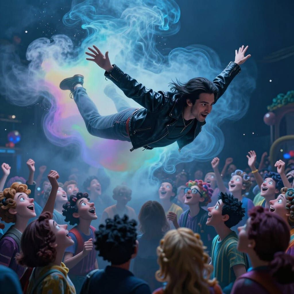 This image shows a man in a leather jacket floating on rainbow smoke above a crowd, set in a luminous, dreamlike blue atmosphere. Rendered in a surreal, caricaturic style.