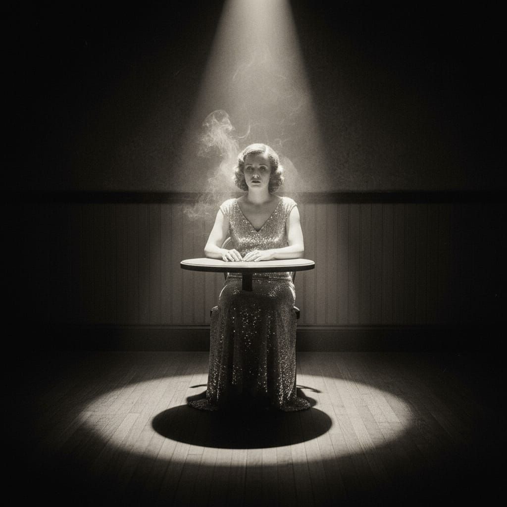 This image depicts a melancholic woman in a vintage sequined dress within a dimly lit jazz club. Dramatic lighting emphasizes swirling smoke, creating a gritty noir atmosphere with deep shadows and stark contrasts.