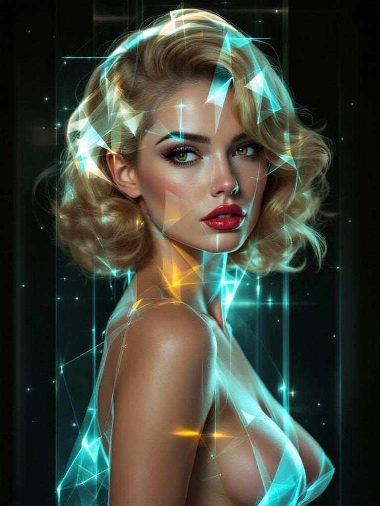 A striking picture of a blond pin-up woman from the 1950s. The image blends neoclassical art with transparent display technology, creating a hyperlucent effect with holographic depth.