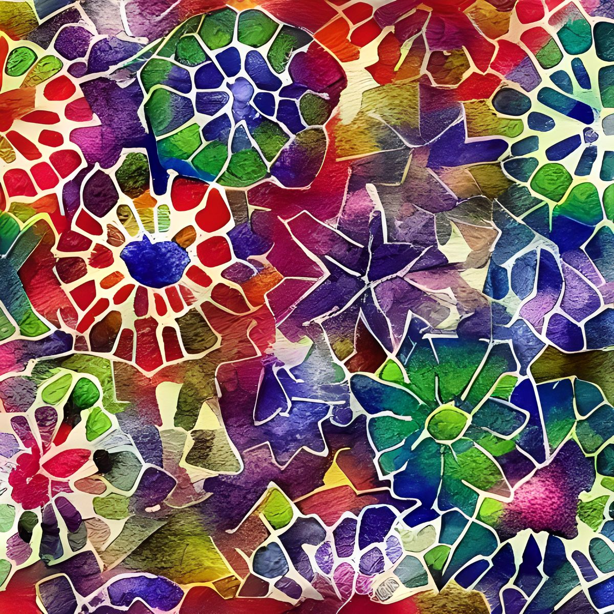 This image shows abstract overlapping shapes filled with unique textures, rendered in watercolor style. The artwork features vibrant colors and intricate details, creating a visually engaging composition.