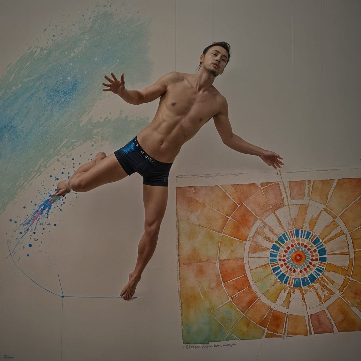 This image shows a vibrant, radial composition with bold brushstrokes, evoking a sense of melancholy in soothing blue hues. It combines elements of Japanese art with a minimalist, solarpunk aesthetic.