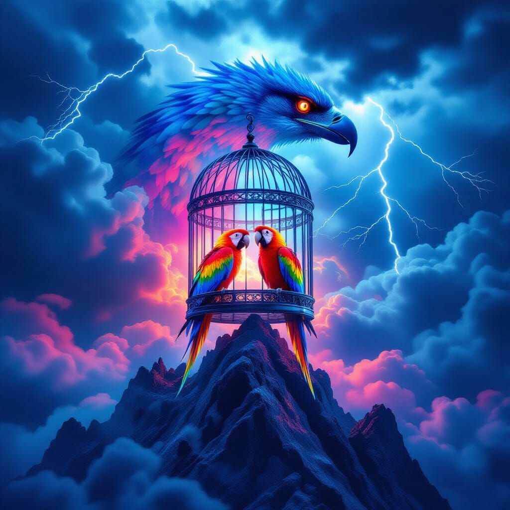 This image depicts a surreal storm scene with a birdcage resembling a giant raptor's claw on a mountaintop. Neon reflections illuminate vibrant parrots sheltered within, set against dramatic, lightning-filled skies in a fantastical, hyperrealistic style.