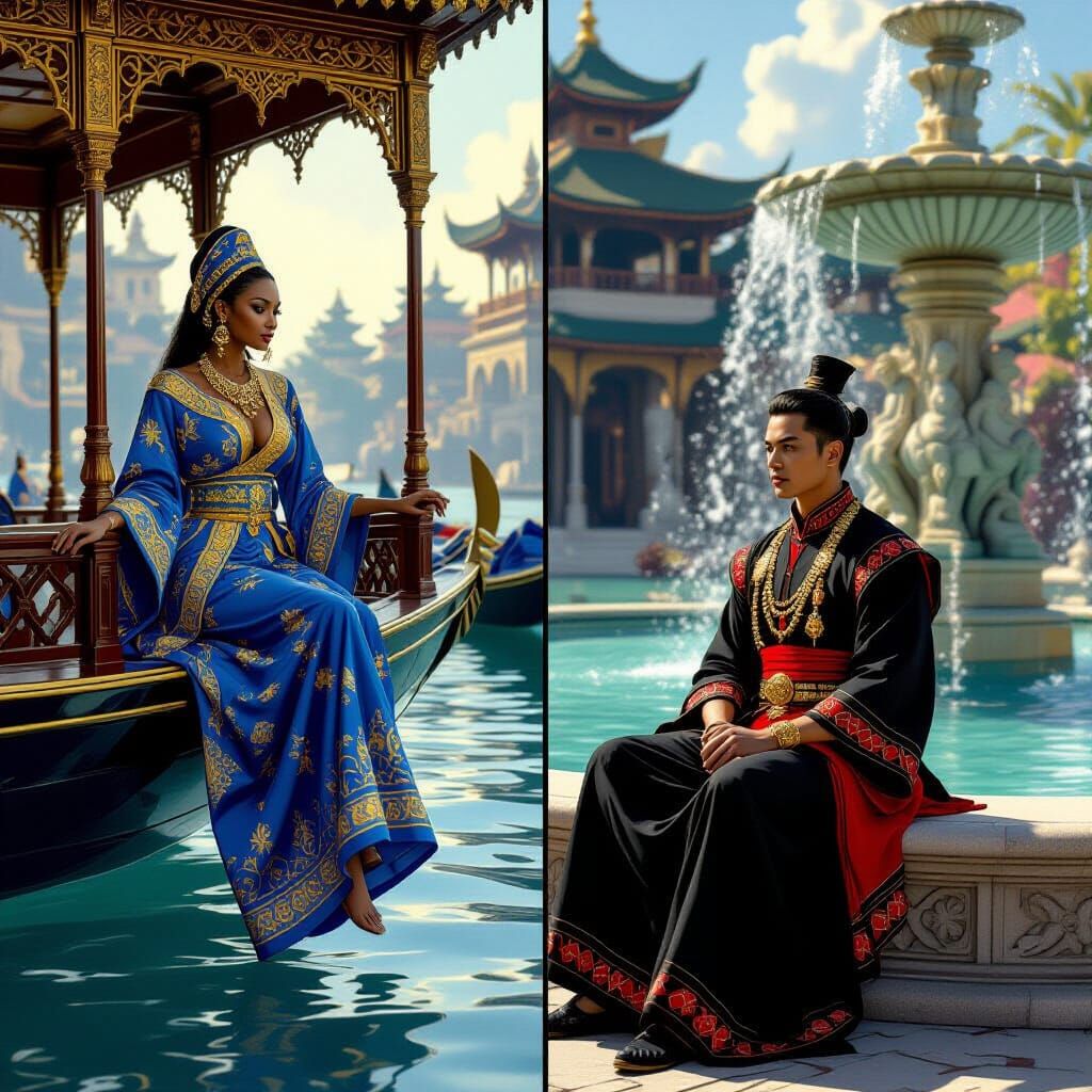 A digital artwork split into two scenes. On one side, an African woman in blue and gold Berber robes. On the other, a Thai man in traditional clothing by a Renaissance fountain, in a dark fantasy style.