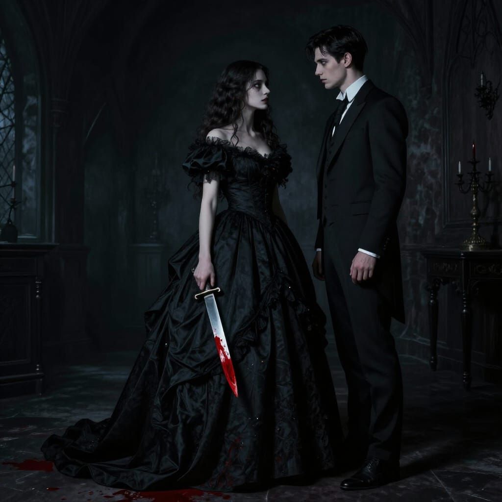 This image depicts a beautiful young woman in a black gown holding a blood-stained knife in a gothic room, with a man beside her. The scene is rendered in a dramatic, painterly style with deep shadows and rich jewel tones.