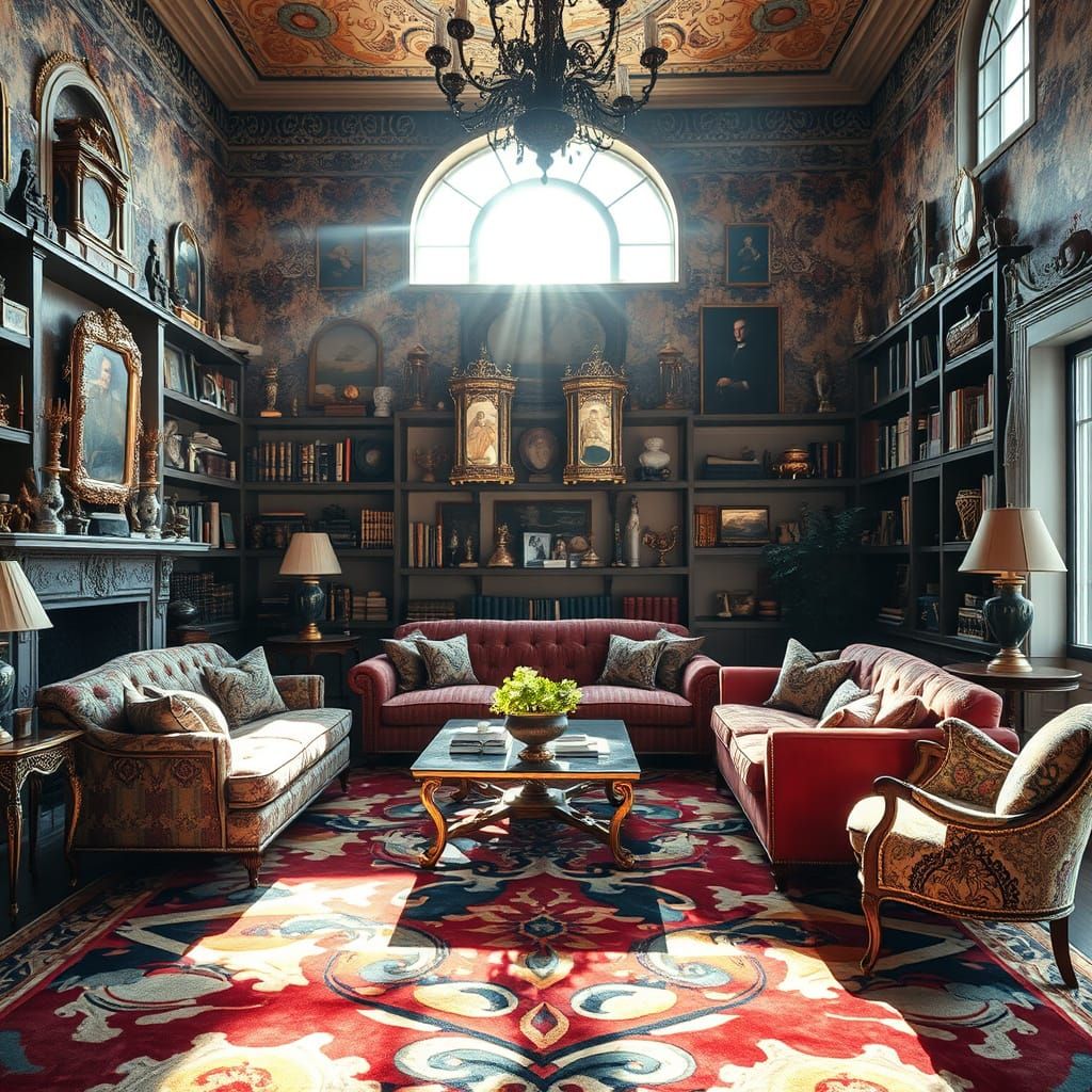 This image shows a stunning, photorealistic maximalist living room filled with ornate details. Sunlight highlights antique treasures on shelves, a vibrant abstract carpet, and richly textured furniture.
