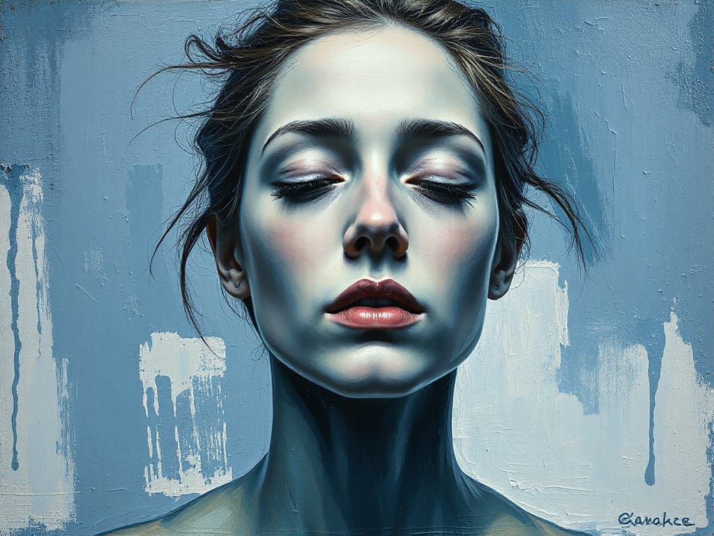 This impasto oil painting features a woman with eyes closed, rendered with thick, textured brushwork in a blue and white palette. The expressionist style conveys poetic melancholy and moody atmosphere.