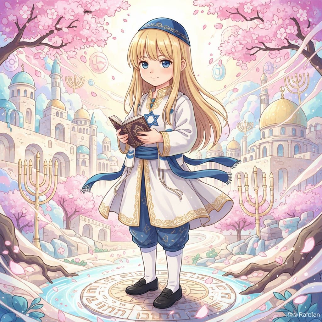 This image depicts a young Jewish boy with blond hair and bangs, styled in a vibrant anime aesthetic with intricate details and soft colors.