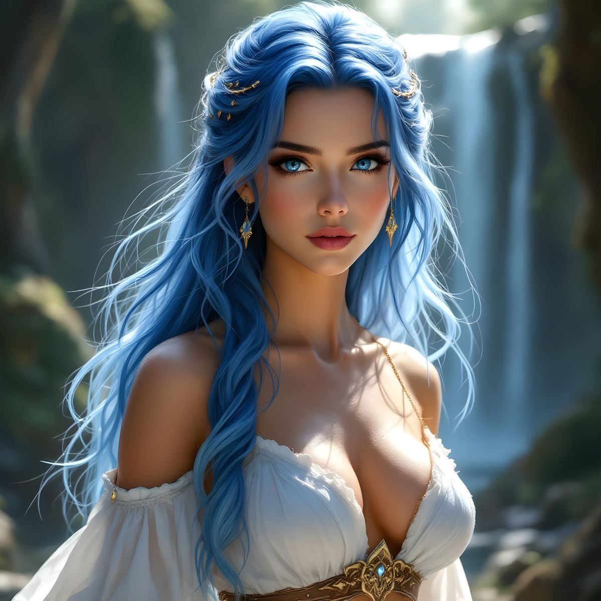 This image shows a beautiful 20-year-old woman with flowing navy blue hair highlighted with light blue, wearing a fantasy warrior outfit. She stands confidently against a waterfall backdrop as digital art.