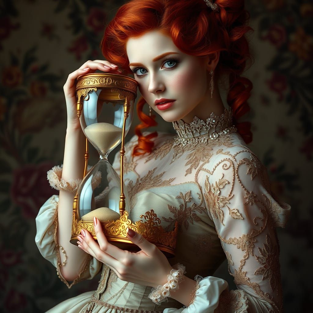 A stunning image of a redhead in a lavish Regency gown, posing elegantly with a golden hourglass, in a dreamy Pre-Raphaelite style with neoclassical colors and intricate details.