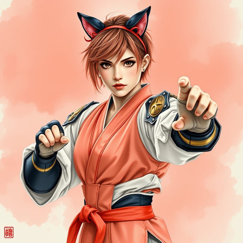 A striking picture of a confident young woman in a karate pose. She wears a coral kimono with gold armor, against a backdrop of pink smoke, in the style of traditional Chinese ink wash painting.