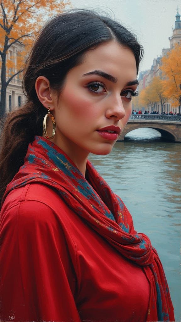 A vibrant oil painting of a British woman with striking eyes by a river. The image features bold, high-contrast colors and textures, blending graffiti and Persian art styles.