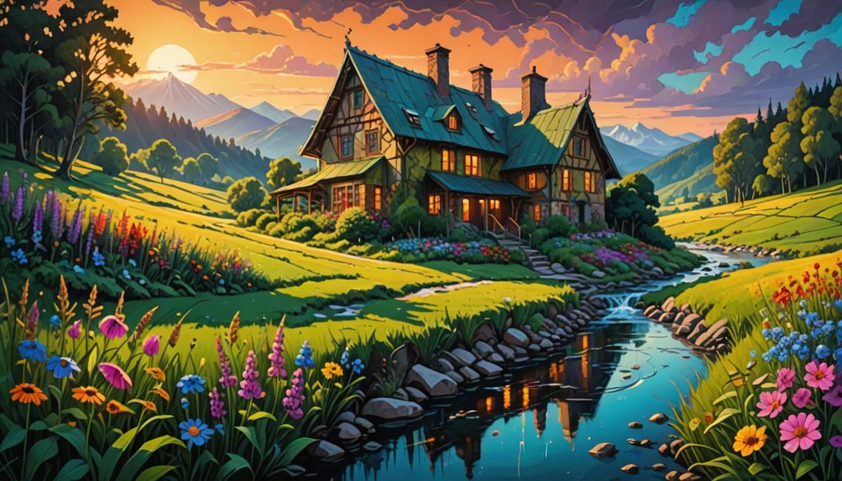 A hyper-realistic digital painting of a quaint cottage nestled in a vibrant, wildflower-filled landscape. Emerald fields meet a gentle river under soft, warm lighting, rendered with expressionist abstract geometry.