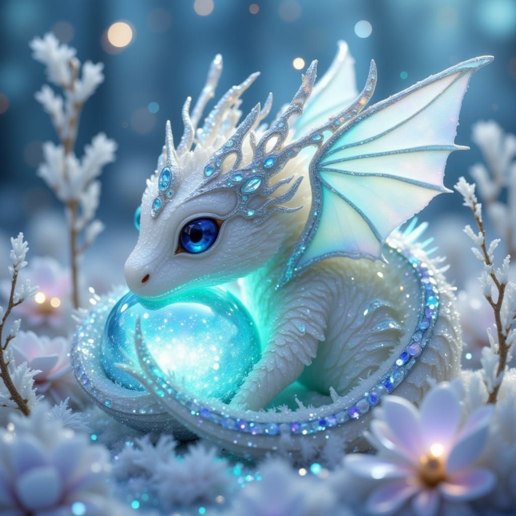 This image shows a detailed baby dragon with luminous ice and crystal features nestled in a snowy fantasy meadow, clutching a glowing orb. Features a cool blue and turquoise palette.