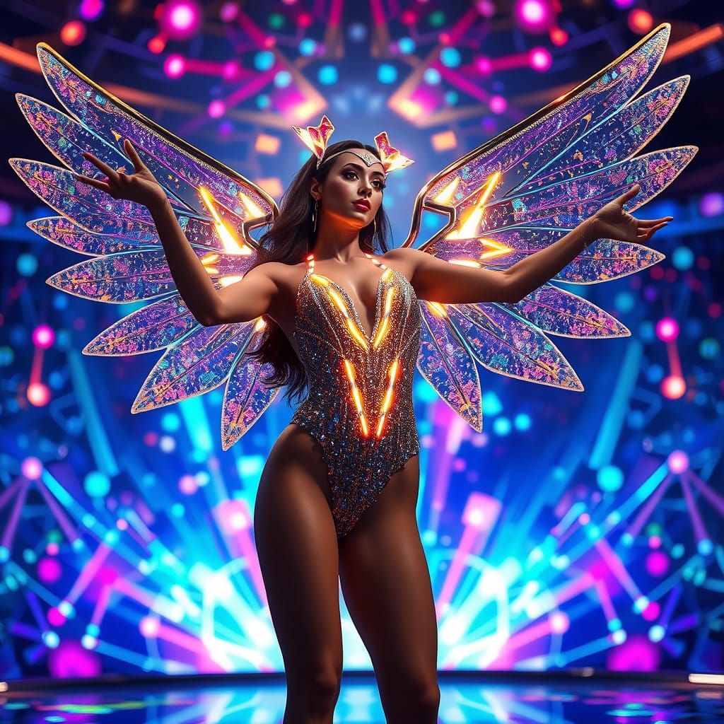 This image shows a futuristic showgirl with iridescent wings and neon circuits performing on a holographic stage. The background features a dazzling display of light and color in a hyperrealistic fantasy concept art style.