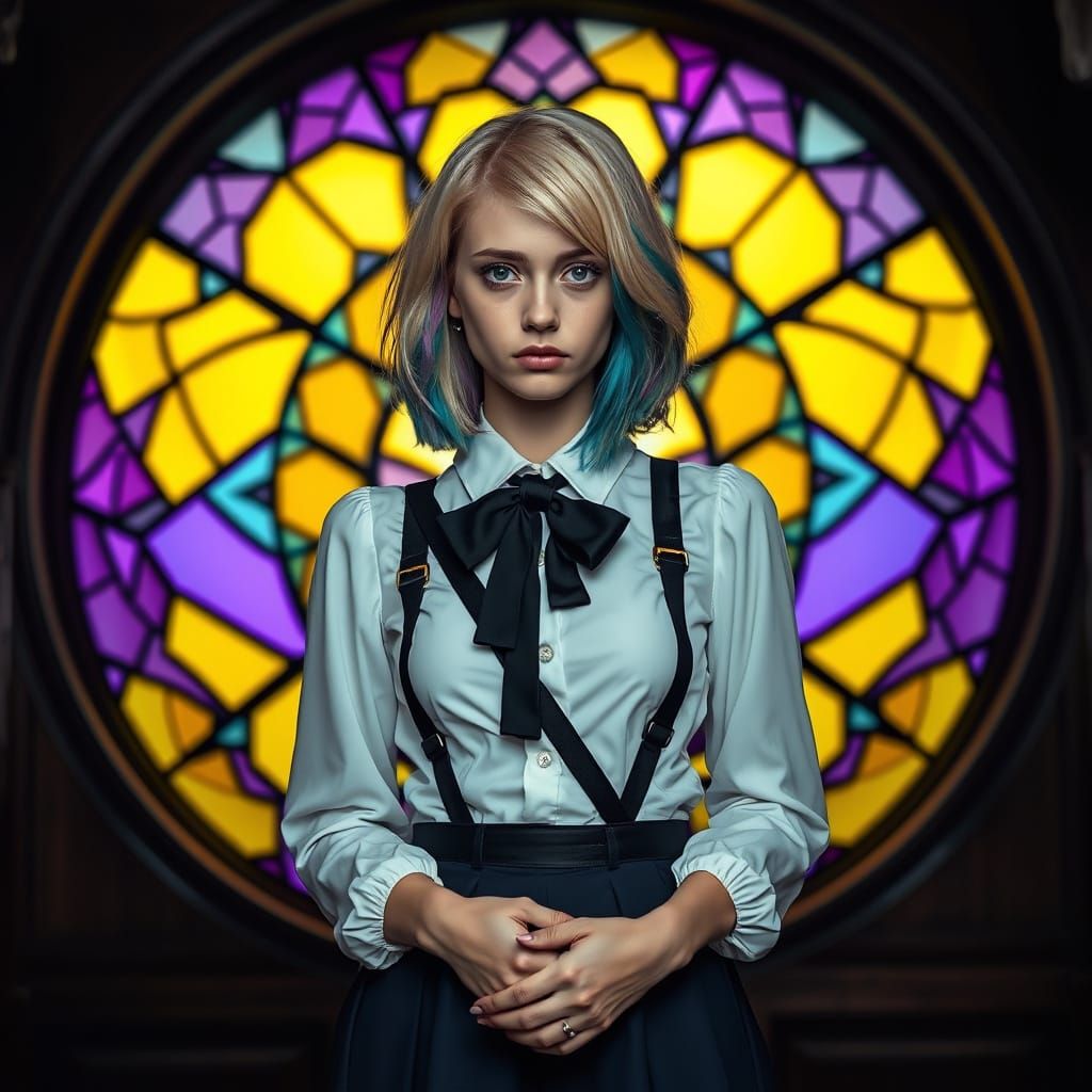 A photorealistic HDR image of a young woman with blonde hair streaks in teal and purple, wearing a white blouse and black harness, stands before a large, colorful stained-glass window.