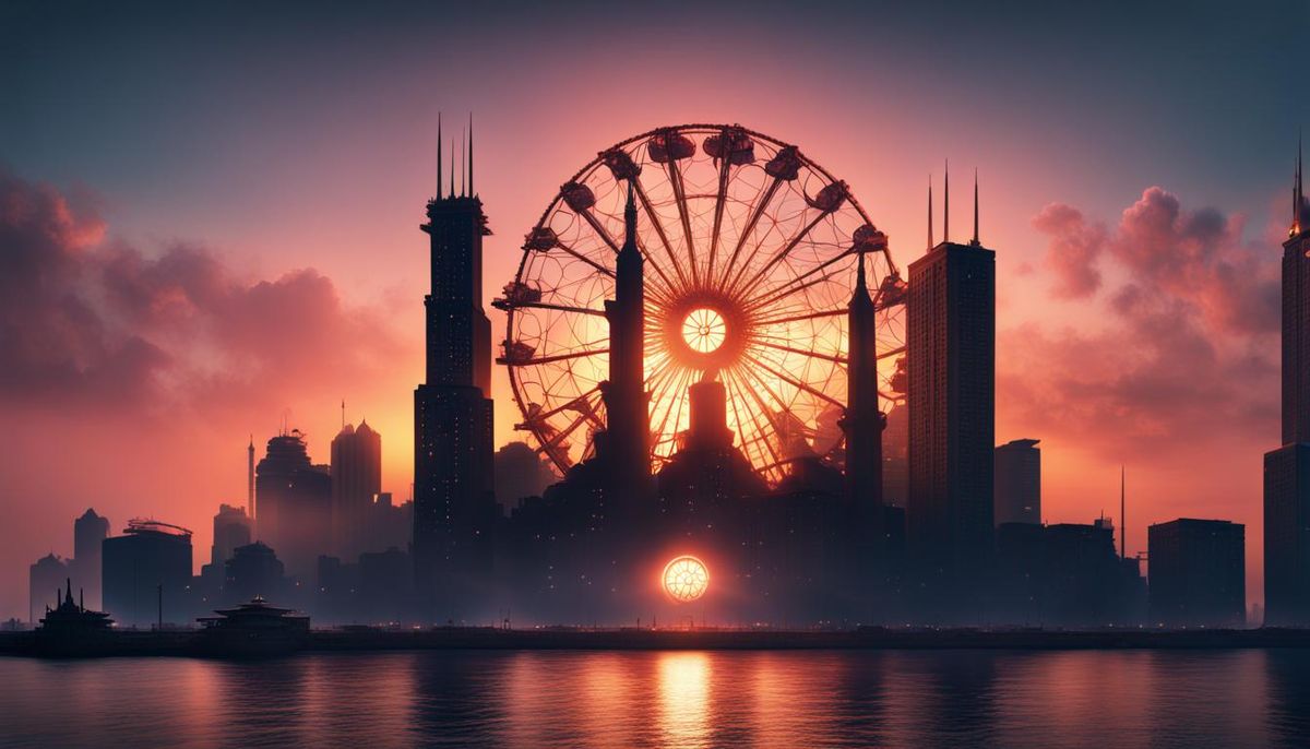 This image shows a stunning Chicago skyline at sunrise, with intricate details and deep colors. Created using Unreal Engine 5 and fractal flare techniques, it features a fantasy concept art style with complementary colors and intricate detail.