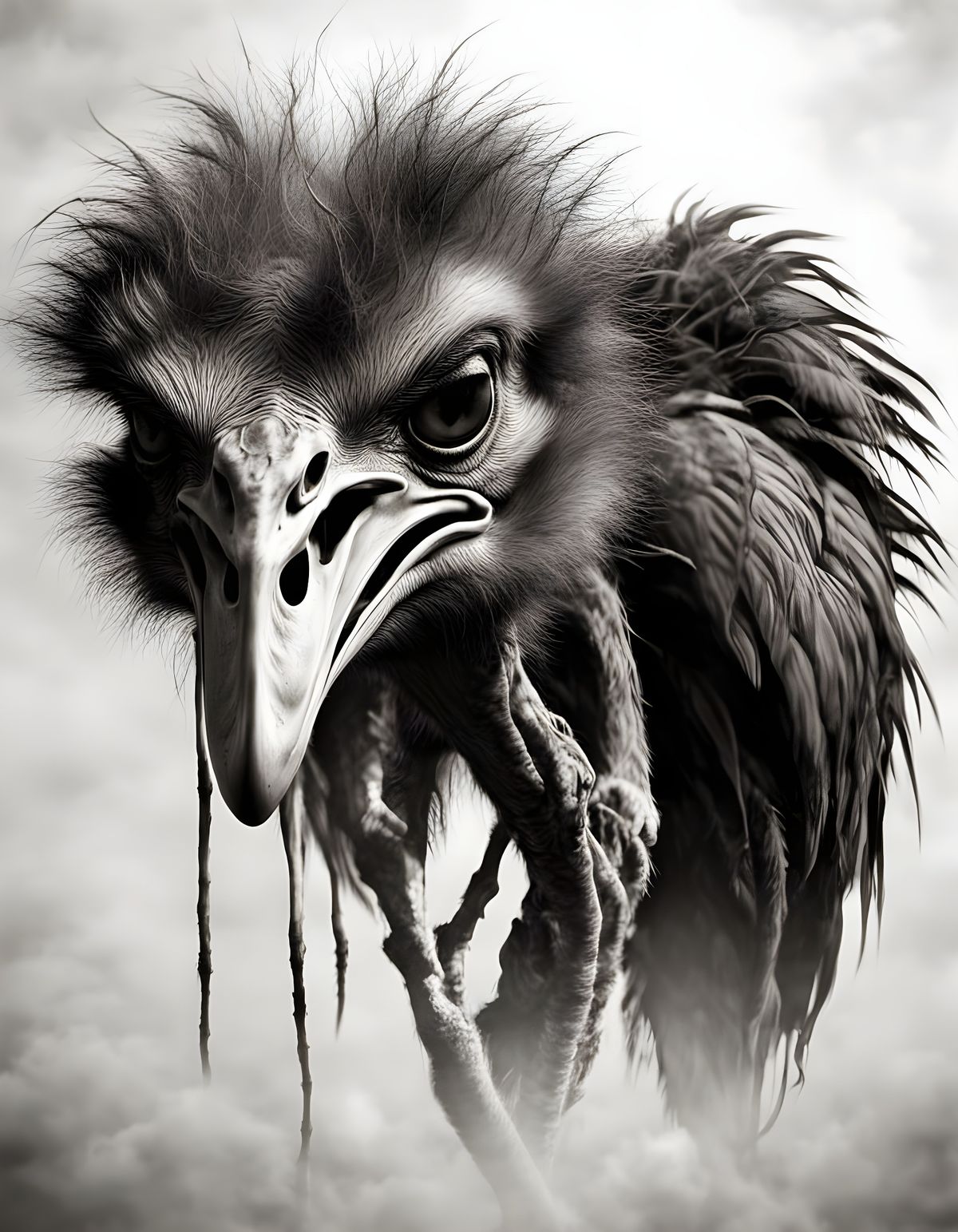 A monochrome image depicts a skeletal ostrich in sepia tones. The artwork evokes a sinister atmosphere, reminiscent of dark fantasy illustrations.