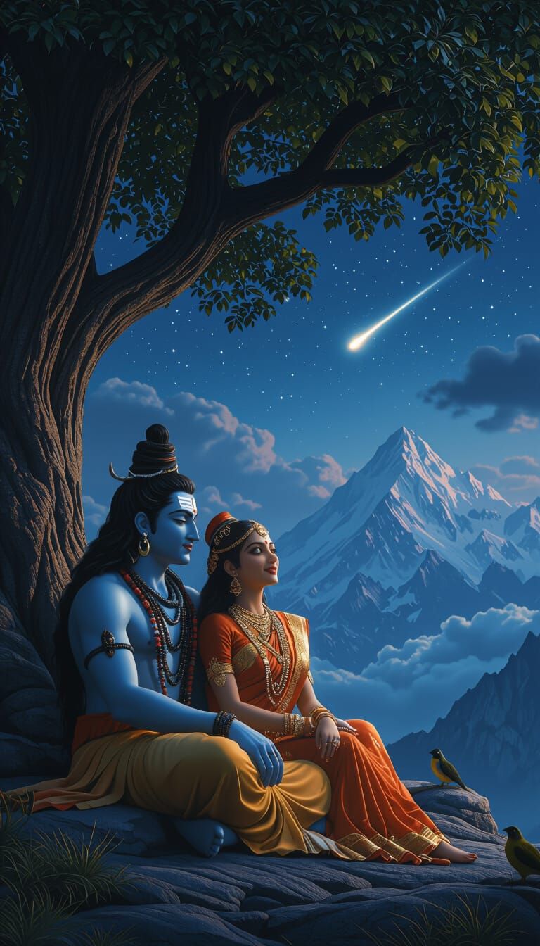 This image shows the Hindu deities Shiva and Parvati sitting together under a tree on a mountain at night. They are gazing at a star-filled sky in a realistic and cinematic style.