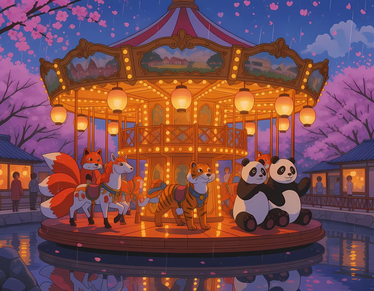 Romantic night at a Japanese festival — elegant wooden carousel with a nine-tailed fox, tiger, Chinese dragon, and panda figures, glowing paper lanterns, gentle rain reflections, cherry blossoms swirling in the air. Inspired by classic 80s–2000s anime (Ghibli, CLAMP, Madhouse) but rendered with ultra-clean 2025 clarity — vivid cel shading, crisp outlines, soft bokeh lights, warm nostalgic colors, dreamy and emotional atmosphere.