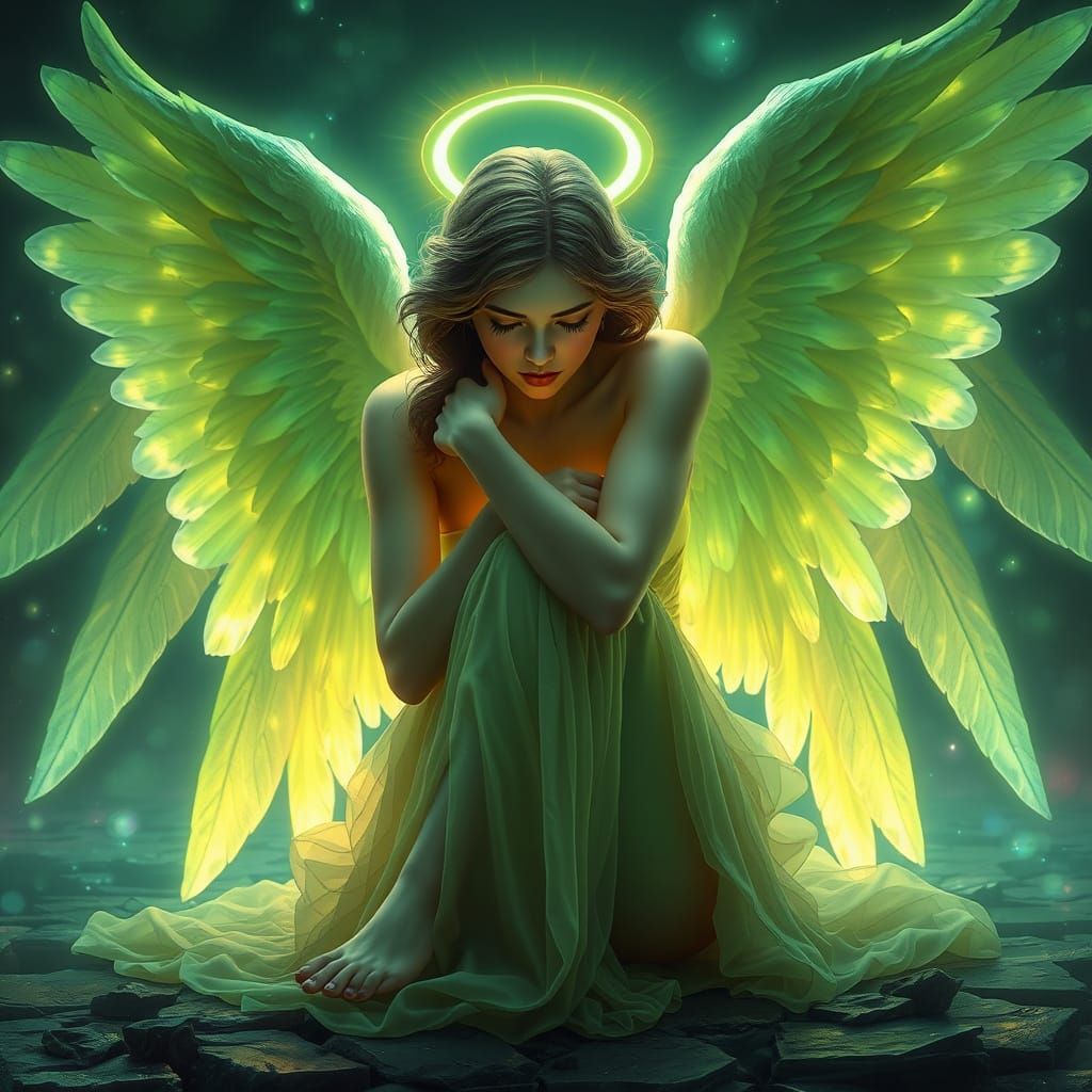 This image shows a captivating, otherworldly angel with a luminous green glow, sitting on the ground, surrounded by a soft, ethereal atmosphere. Created in a vibrant, Art Nouveau-inspired style with sharp focus and detailed, 3D shading, this digital painting exudes enchanting and lively ambiance.