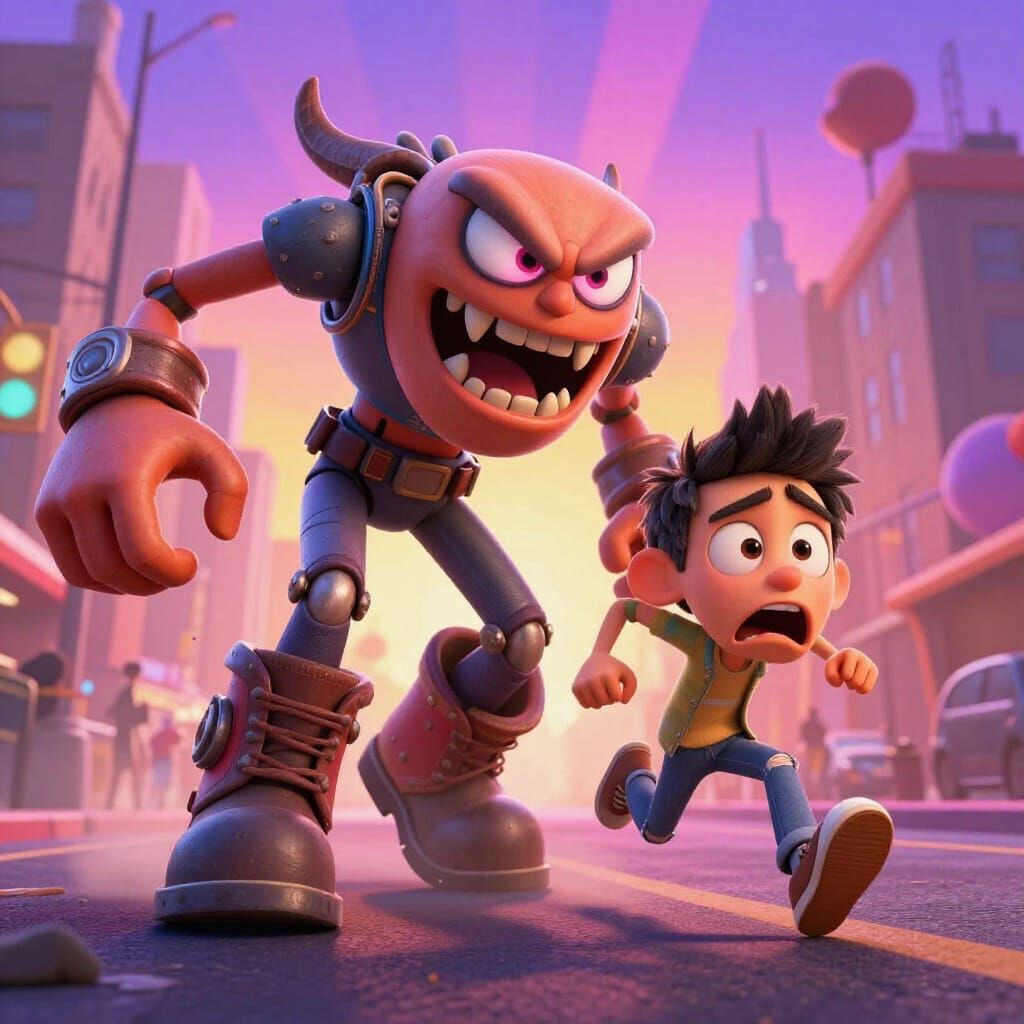 This image shows monstrous boots with teeth and eyes chasing a terrified owner down a busy street, rendered in a lively 3D digital art style with cinematic lighting.
