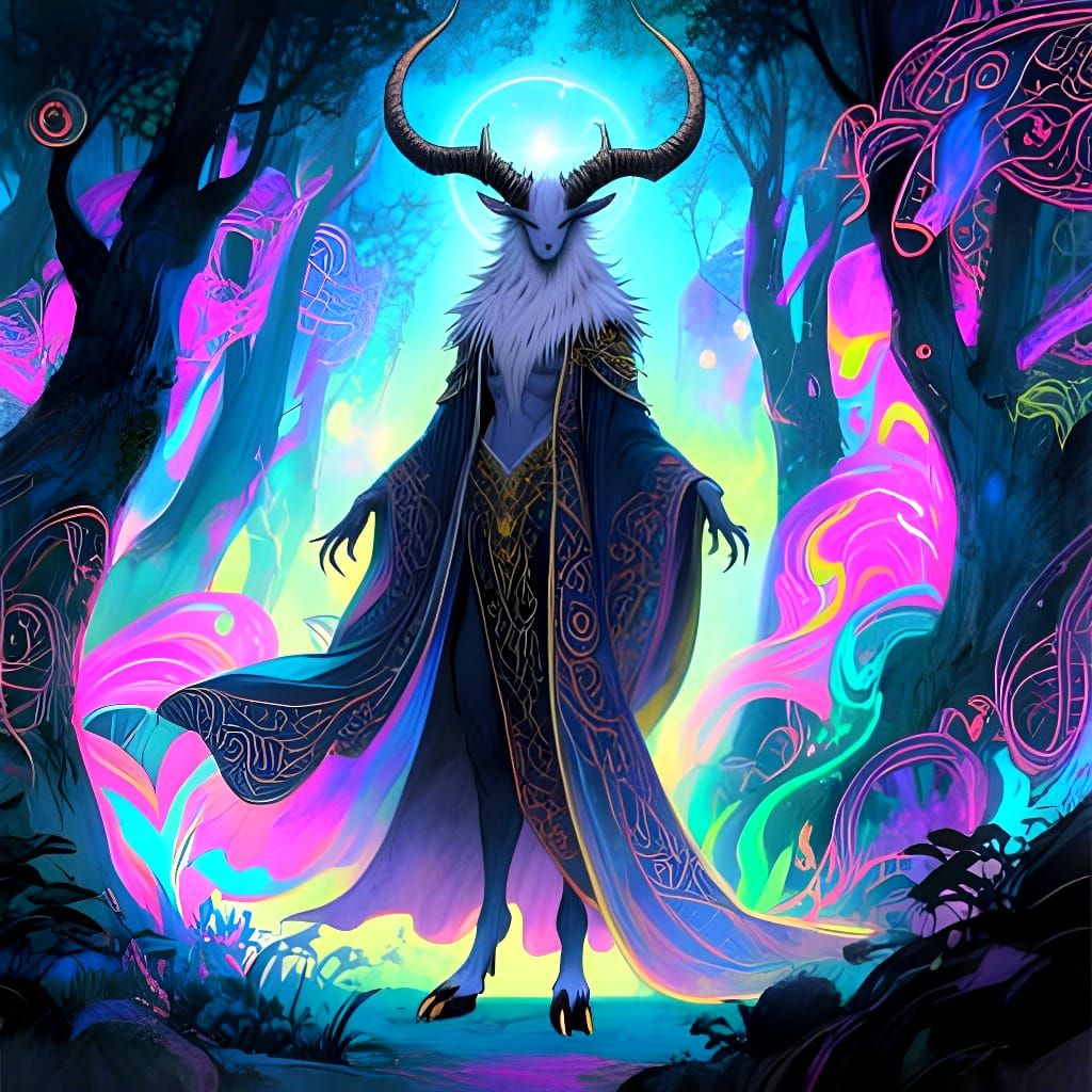 This image shows a celestial forest creature with a human upper body, horns, fur, and hooves, set in an enchanting forest with a mysterious aura. The art style is reminiscent of manga splash art with neon colors.