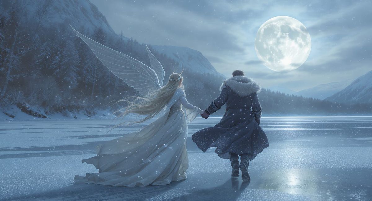 This image shows a fae guiding a man across a frozen lake under moonlight. The scene has intricate textures and subtle reflections, in a style reminiscent of atmospheric digital painting.