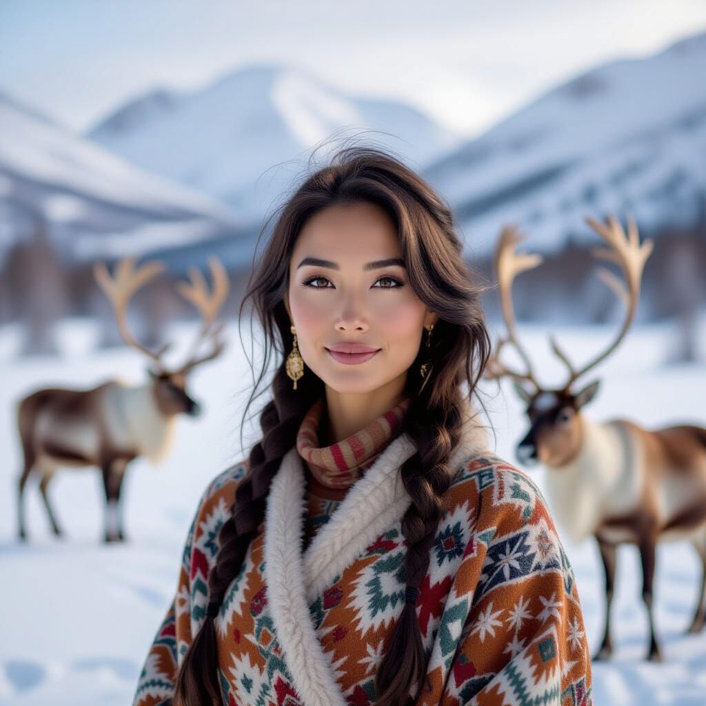 This image shows a Saami woman in a landscape with reindeer. The woman has dark hair and warm, chestnut-brown skin. The style evokes a blend of earthy tones, cultural sensitivity, and Asian-inspired features.